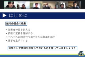 この場では、 ・指導者の目を揃えること ・技術の「定義」の理解 ・選手へ示す「基準」の確認 ・選手の成長につながる指導の共有 などを目的として、意見交換や情報共有を行いました。